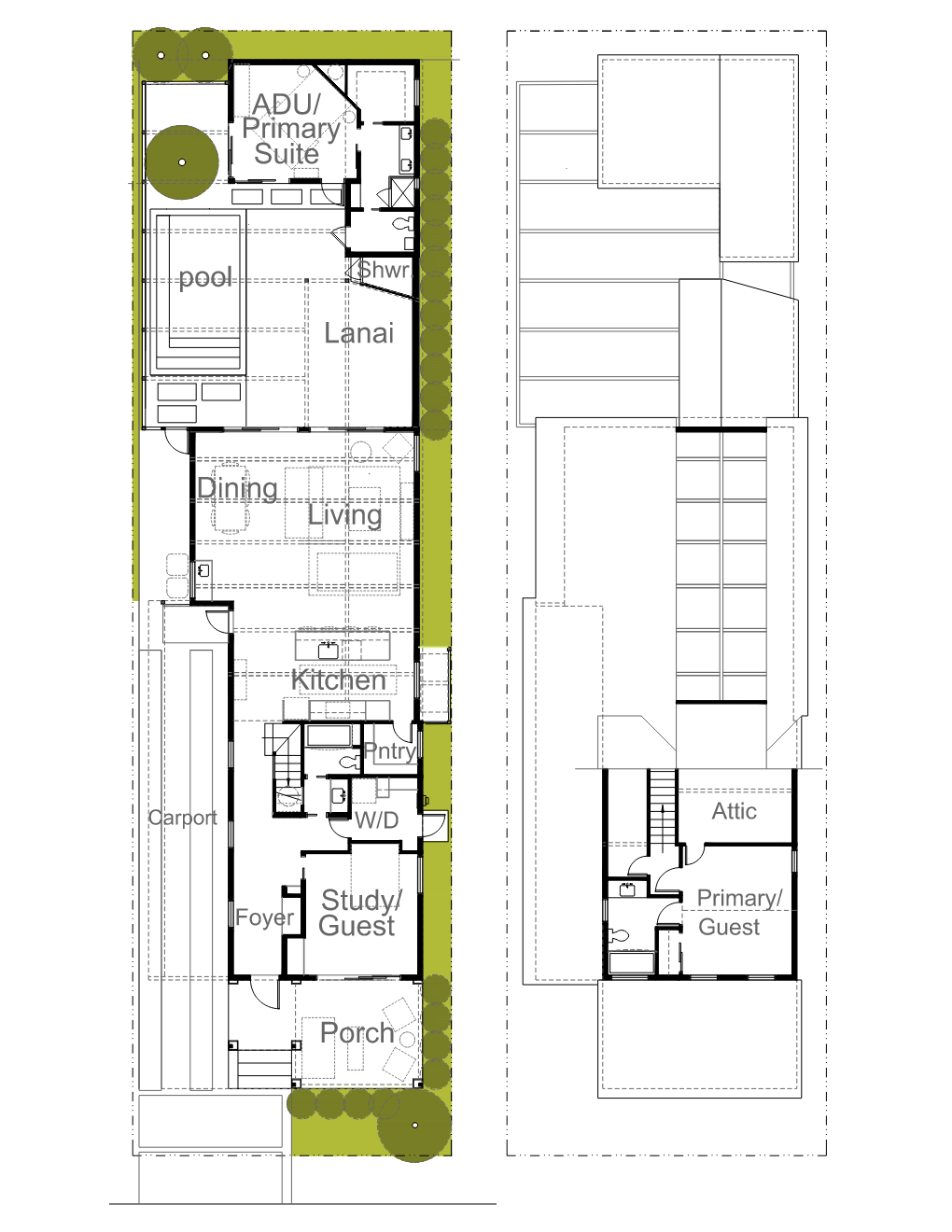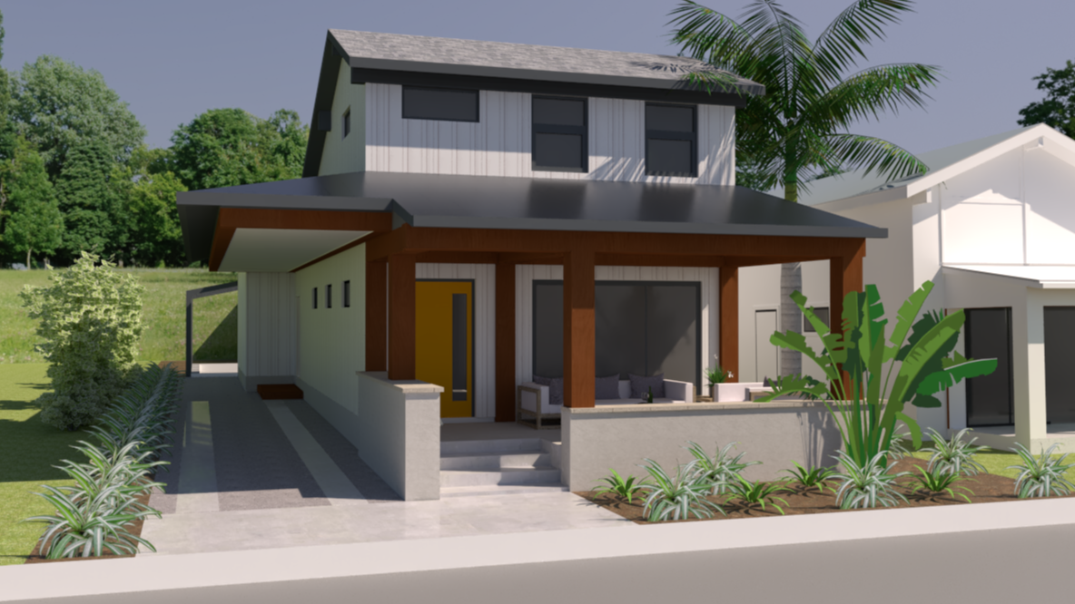 The three bed / 2.5 bath plan is organized to take advantage of the Gillespie Park views at the front and a screened lanai / pool area at the back. Dual primary suites are planned with one located in an ADU. The house is planned to have a “modern farmhouse” appearance with a large front porch with retractable insect screens to provide an outdoor living area overlooking the park.