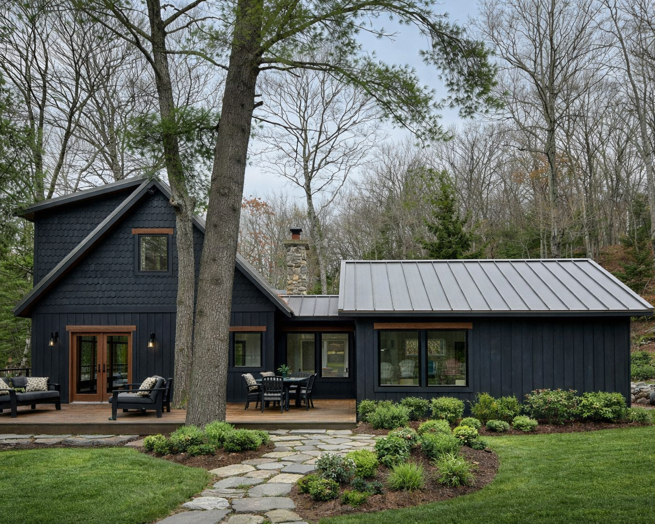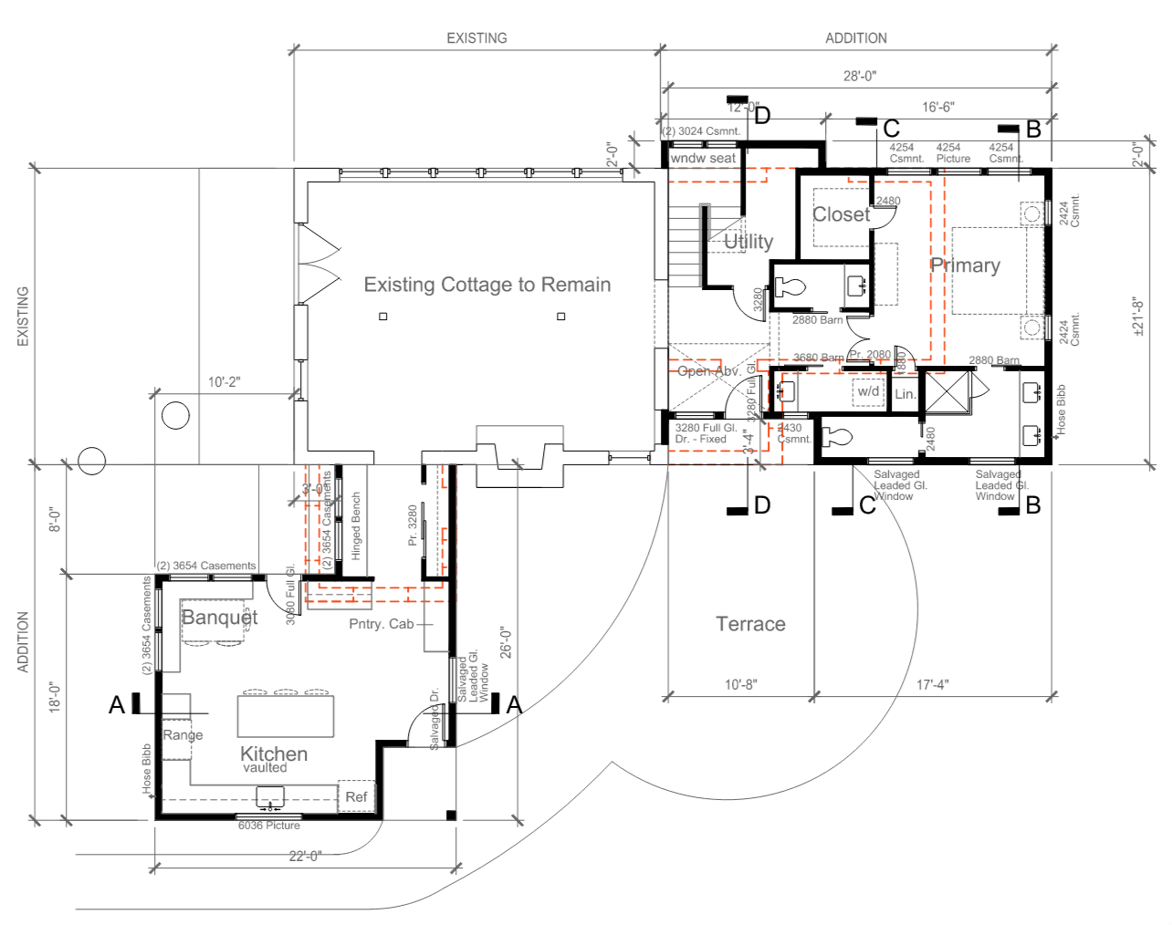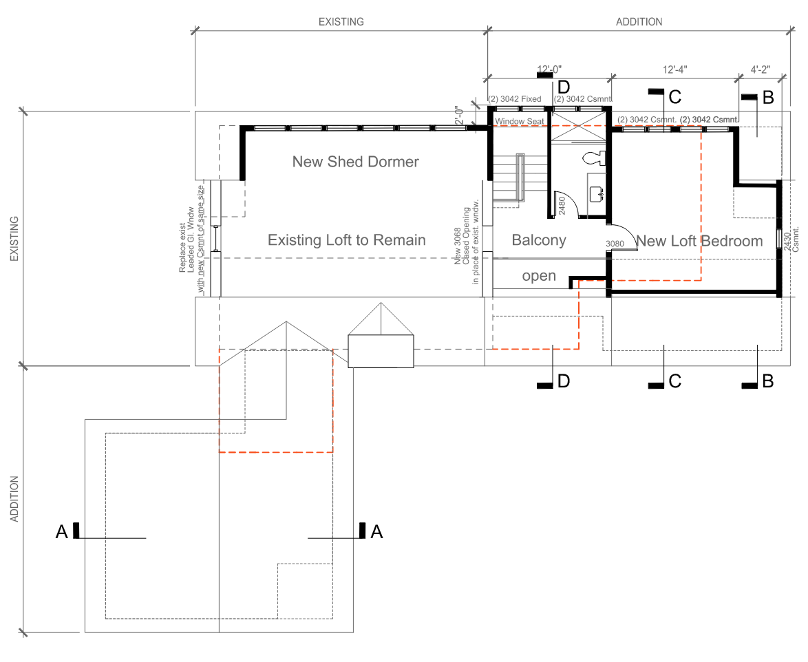 The expansion included a new eat-in kitchen, primary suite, and a new stair leading to the expanded loft level with guest accommodations and bath.